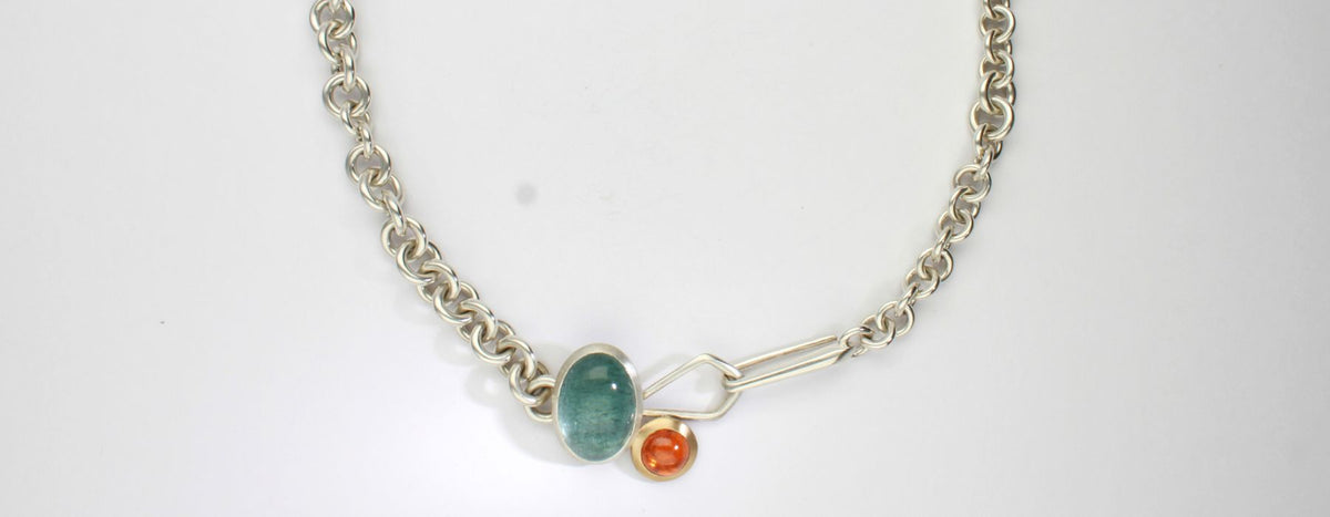 MT Gallery Artists Camur heavy-weight necklace with aquamarine & mandarin garnet silver & 18ct gold by Emily Thatcher