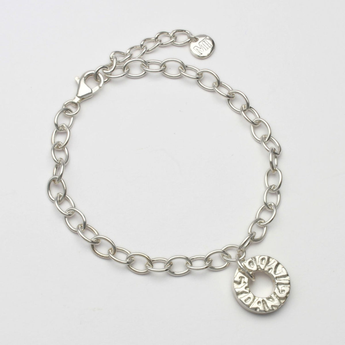 A unique symbol of togetherness: Gyda'n Gilydd (meaning together in Welsh) is created from solid silver and featuring linked circles etched in Mair's handwriting, perfect for expressing your bond with a loved one. Celebrate your unity with this beautiful, handcrafted keepsake to cherish forever, a touching reminder of your connection.