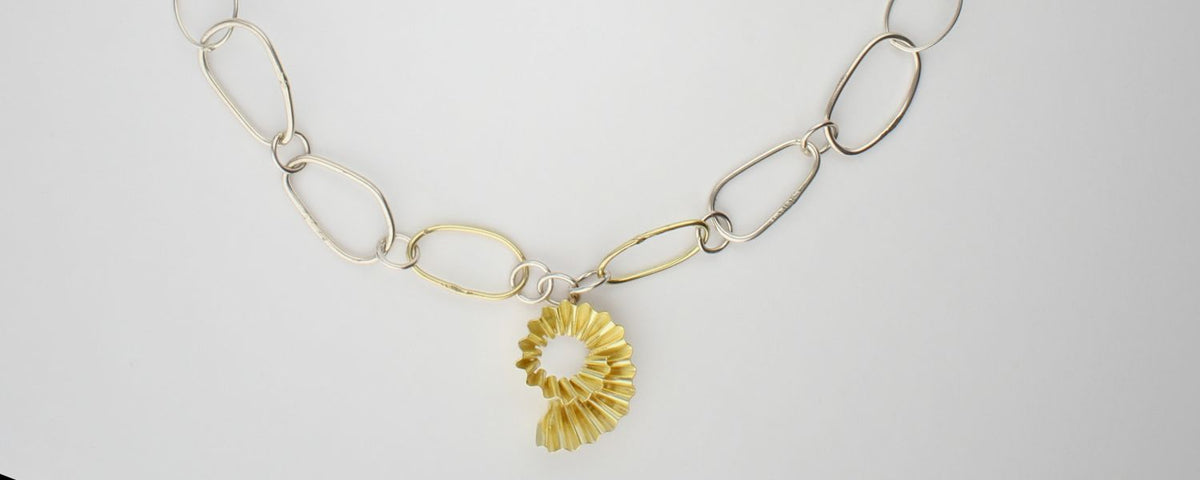Suzie Horan's bold contemporary designs in silver stem from the movement and reflections of the sea coupled with the qualities found in the delicate but naturally strong structure of ammonites. Winner of the Gold Medal at the National Eisteddfod of Wales 2008 she also designed and made the Bardic crown in 2010.