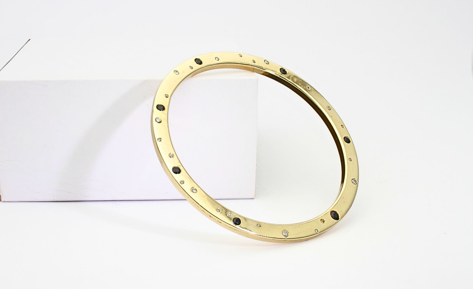 4 unused gold rings melted and remodelled into a contemporary bangle sprinkled with sparkling diamonds and sapphires.