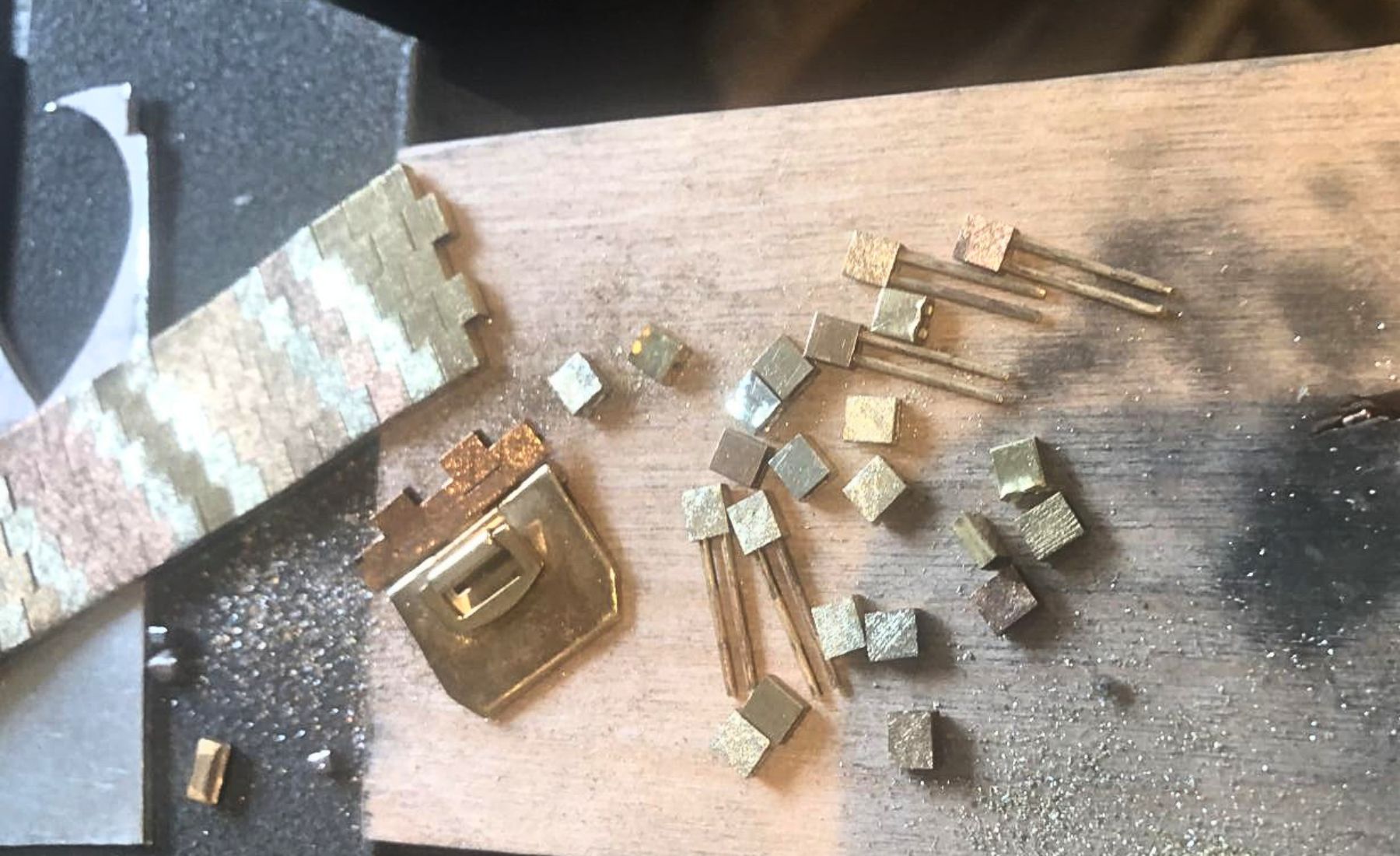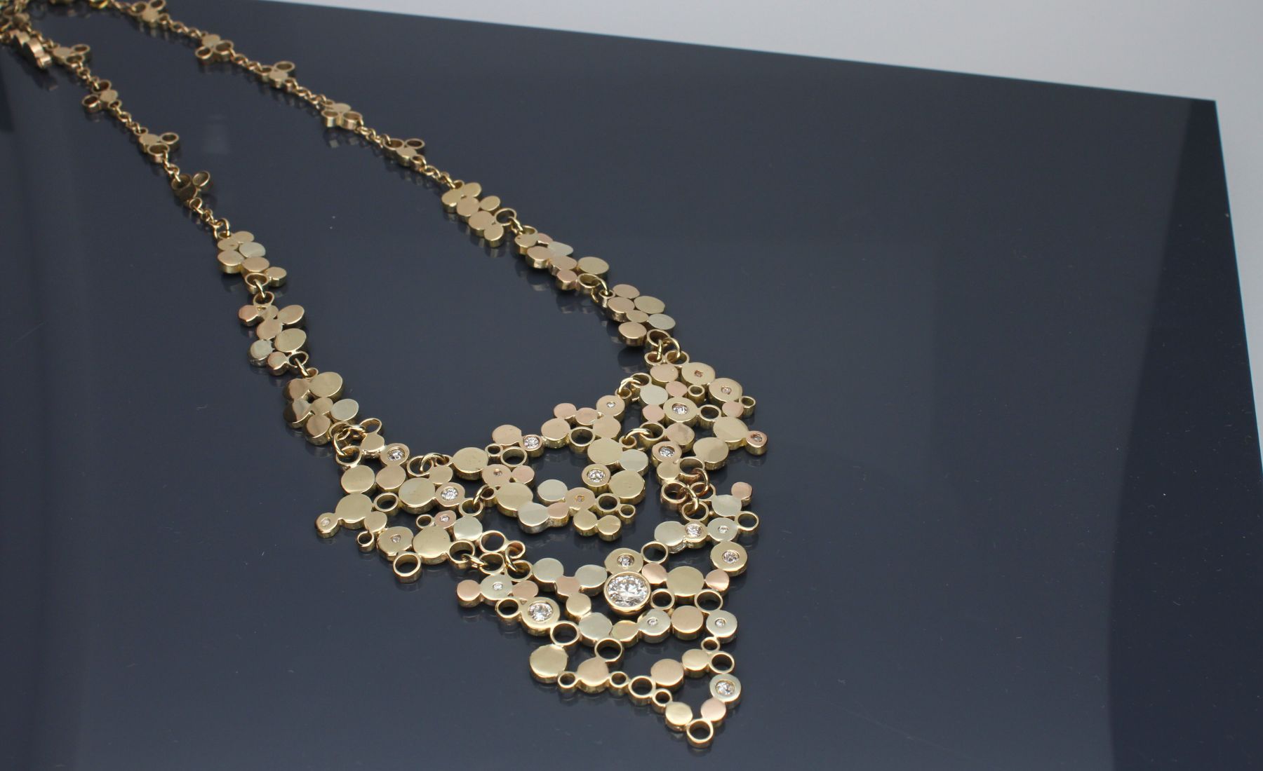This unused and unloved bracelet in three colours of 9ct gold was painstakingly taken apart separating all the different colour golds. It was then remodelled keeping all the individual colours of gold into this beautiful bespoke statement necklace set with a scattering of diamonds.