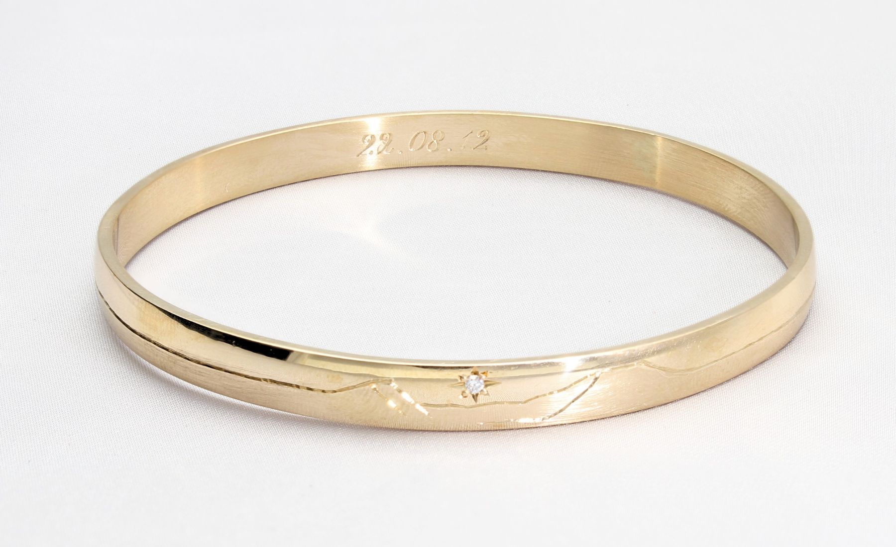 Gold ring and bracelet chain melted and remodelled into a solid gold bangle, hand engraved and set with a diamond.