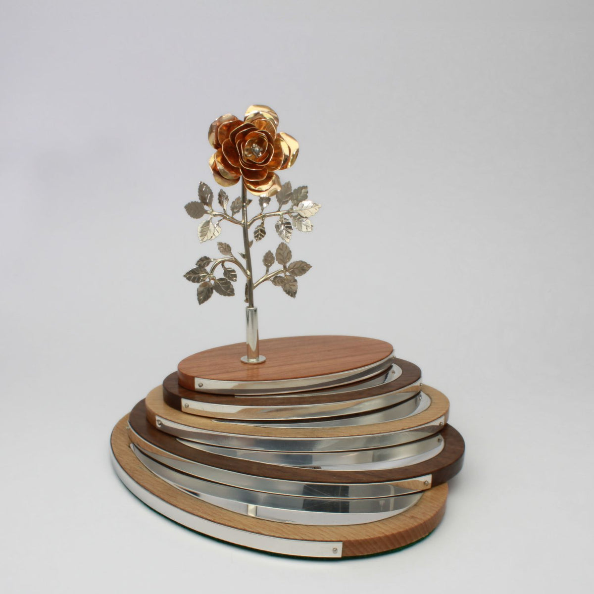 18ct rose and white gold brooch sitting on a handcrafted wood kinetic base (made by Jonathan Garrard) inlaid with hand-engraved silver.
